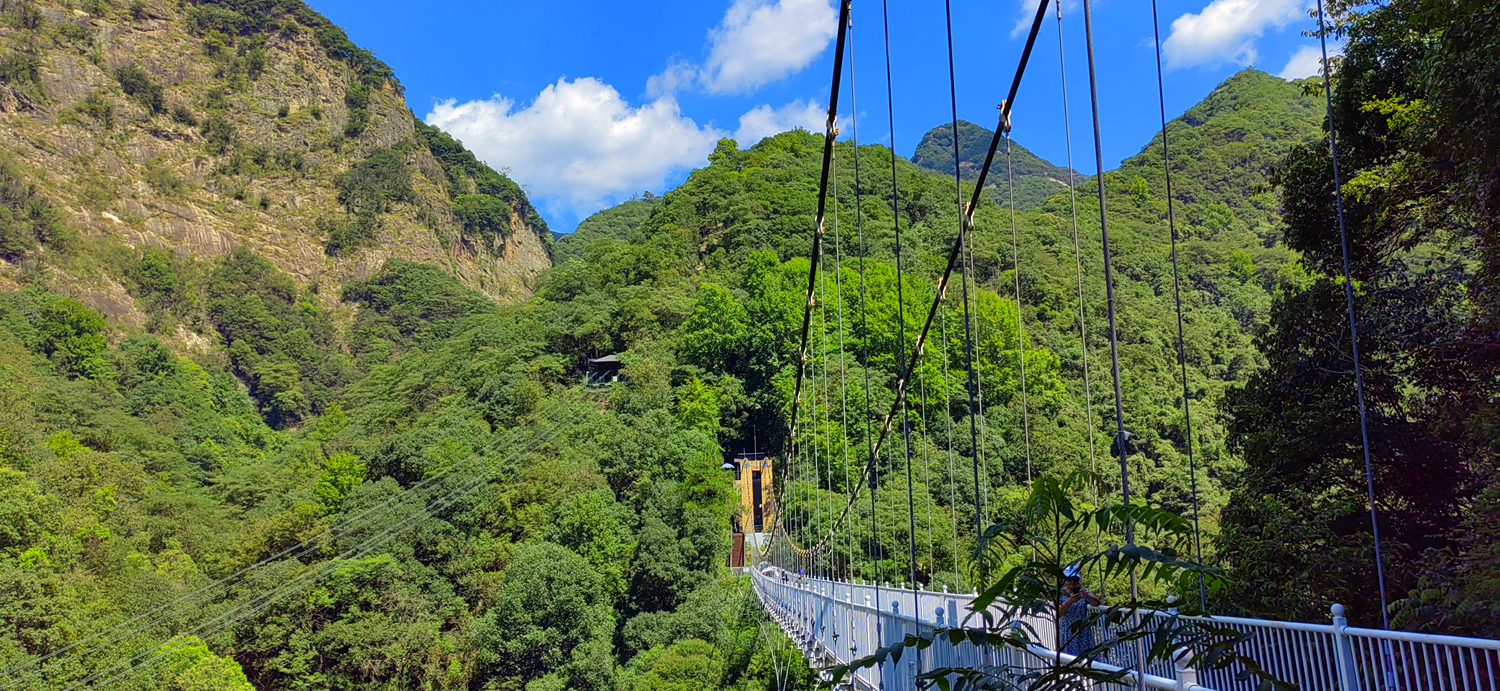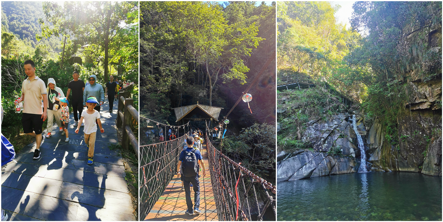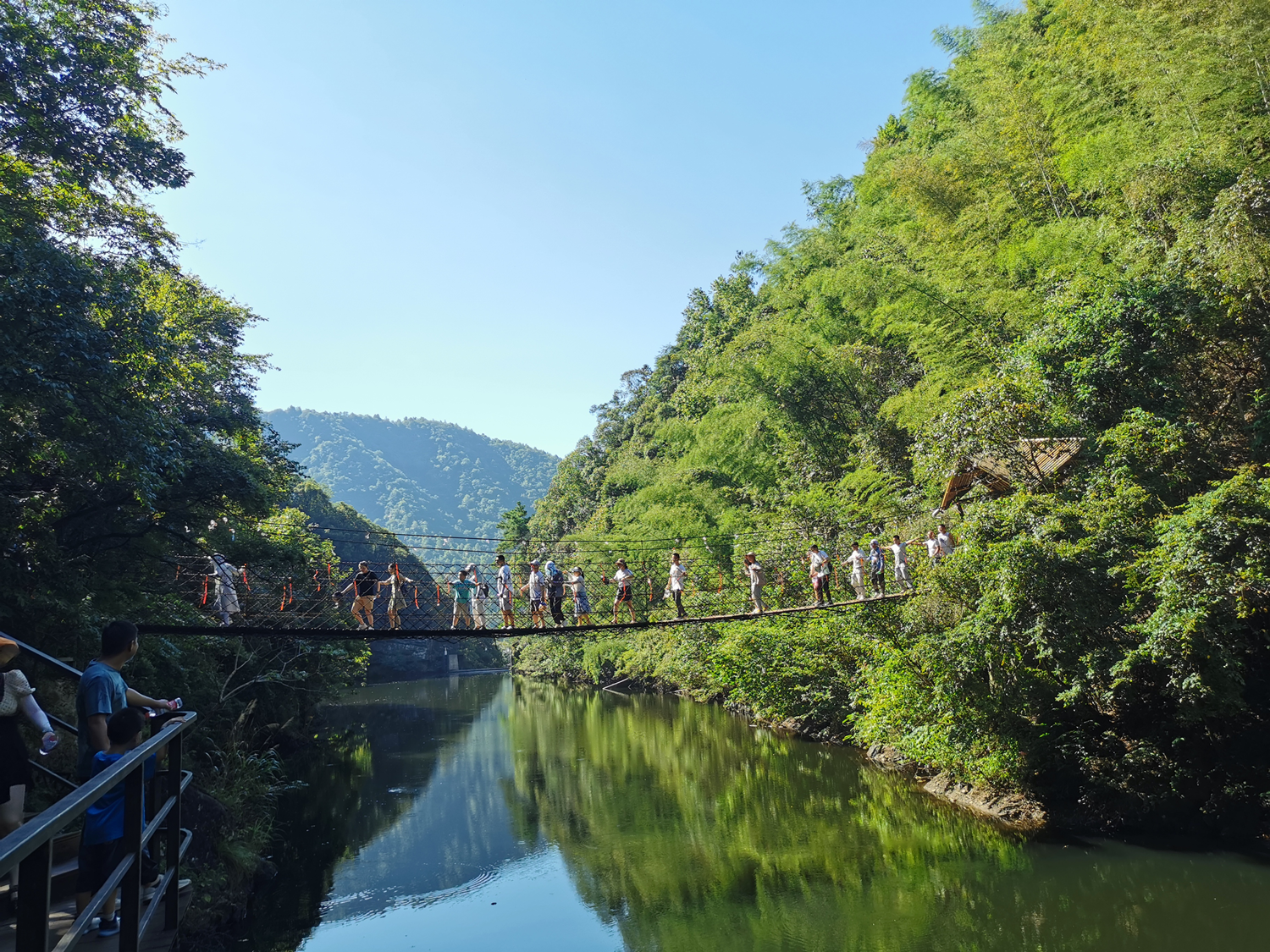 晚上體驗(yàn)了農(nóng)家樂(lè)菜肴和當(dāng)?shù)靥厣袼藓?,第二天早早的起床,吃完早餐集合,大家興致勃勃地乘著大巴來(lái)到了醉山野景區(qū),這里是安徽省內(nèi)第一個(gè)5D玻璃橋皖南地區(qū)最大的瀑布群。在進(jìn)入景區(qū)之前,有一段鄉(xiāng)村道路,徒步的過(guò)程頂著早上八九點(diǎn)的太陽(yáng)就覺(jué)得酷暑難耐,然而當(dāng)我們正式踏入景點(diǎn),走在山谷間的步棧道上,遠(yuǎn)處是蔥郁的山林、近處是流動(dòng)的溪水、頂上是一片陰涼,只聽(tīng)見(jiàn)大朋友們小朋友們都在說(shuō)“好涼快啊,好涼快啊!”沿著步棧道繼續(xù)前行,來(lái)到了千花橋,這里是著名的網(wǎng)紅打卡點(diǎn),小朋友們都絡(luò)繹不絕的脫下鞋子、挽起褲腳,下水嬉戲游玩。有合影拍照的、有撿起小石片仍水花的、還有在石頭縫里抓螃蟹的。大家坐在陰涼的石頭塊上休憩閑聊,甚至玩笑起來(lái),富硒山水、天然氧吧,以后老了退隱山林一定要來(lái)這里休養(yǎng)生息。有人不被沿途風(fēng)景耽誤過(guò)久,繼續(xù)往山上攀爬,他們到了山頂穿過(guò)了玻璃棧橋,體驗(yàn)了“一覽眾山小”的視野和格局。由于兩個(gè)月沒(méi)有下雨,雖有山谷溪流卻看不到震撼的黃崖瀑布群,實(shí)屬遺憾,卻也給大家下次再來(lái)此一游留下了機(jī)會(huì)。